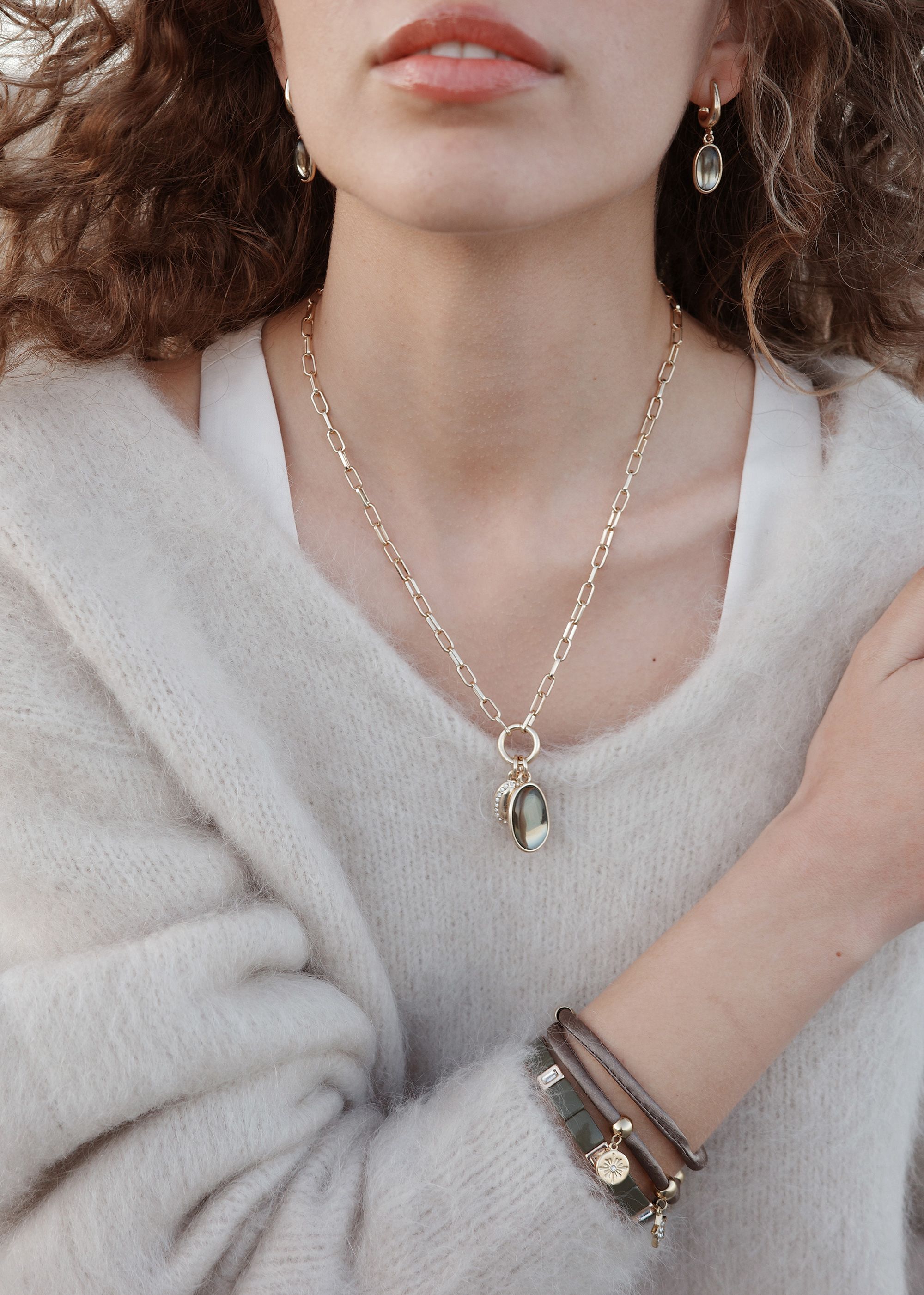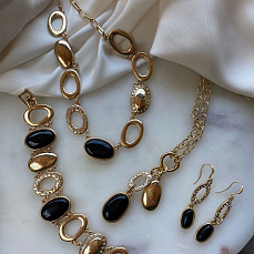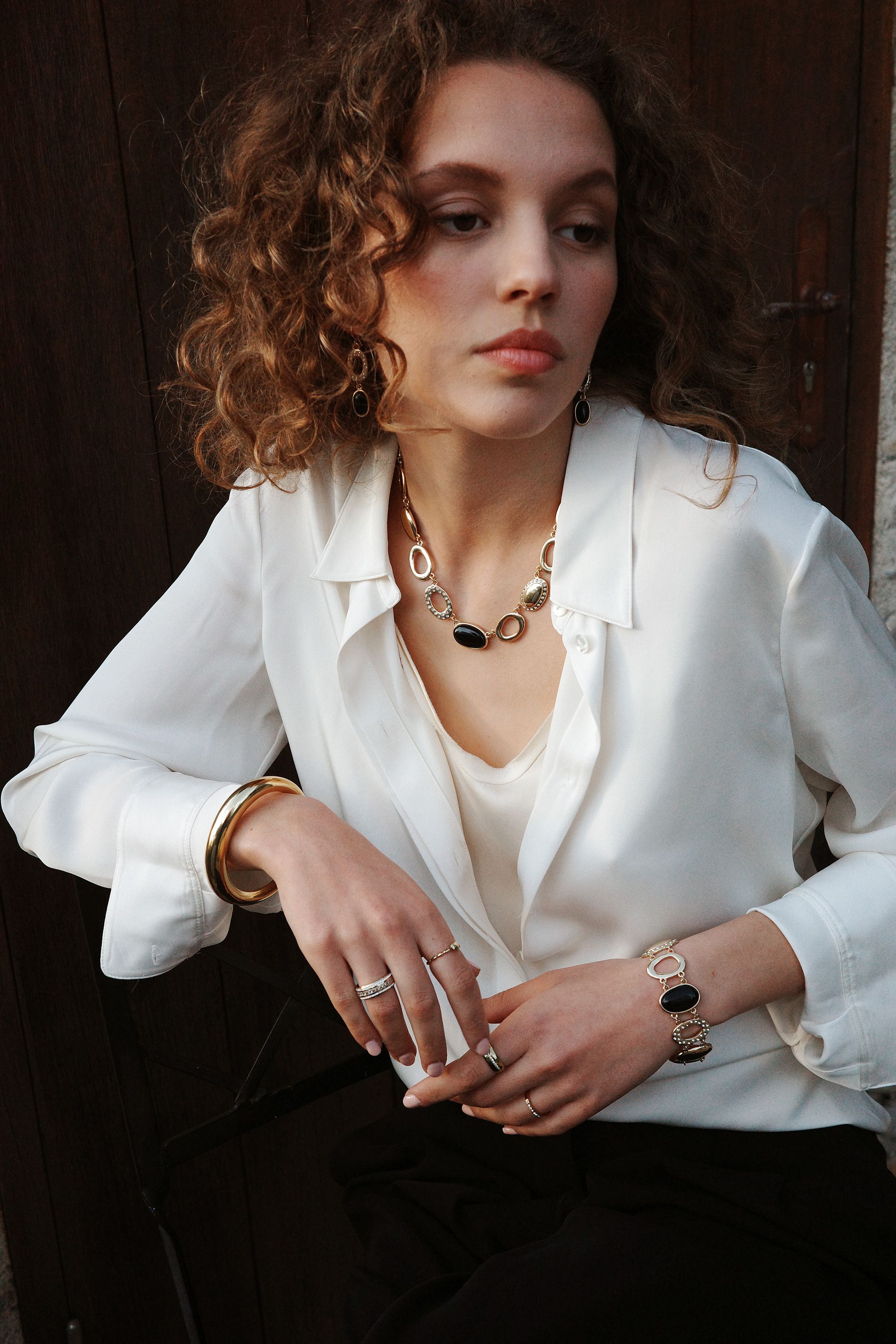 Soft metallic shapes and drops in hand-cut glass. A sleek and timeless collection that works just as well for everyday wear as for special occasions. The jewellery is plated with real gold.