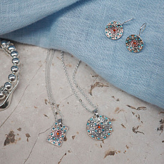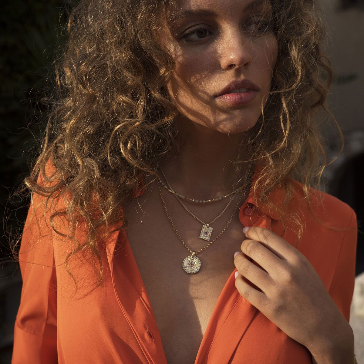 Vibrance is a beautiful, colorful collection adding that perfect touch with your outfit. The collection is based on textured coins adorned with sparkling, colorful stones. Here you can choose single pendants which are perfect for layering. Or if you prefer a bolder look, choose pieces with charms - one of this season"s major trends. Plated with real gold and real silver.