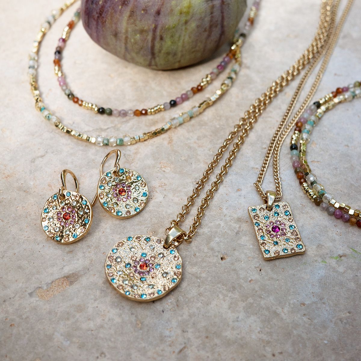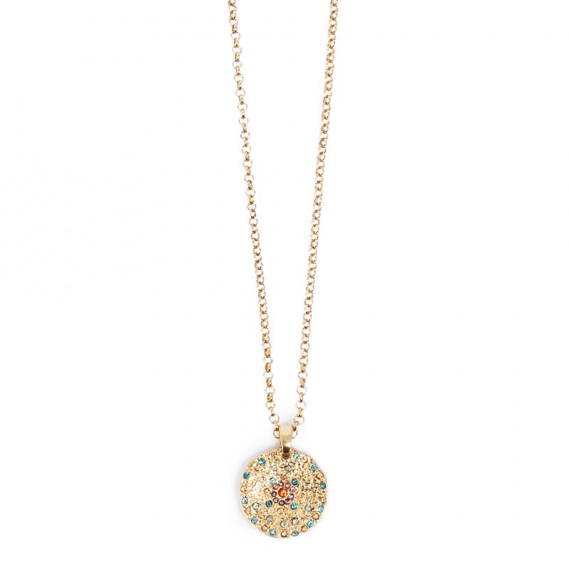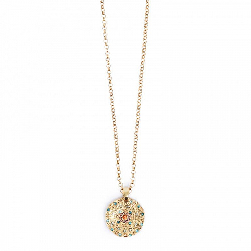 Vibrance is a beautiful, colorful collection adding that perfect touch with your outfit. The collection is based on textured coins adorned with sparkling, colorful stones. Here you can choose single pendants which are perfect for layering. Or if you prefer a bolder look, choose pieces with charms - one of this season"s major trends. Plated with real gold and real silver.