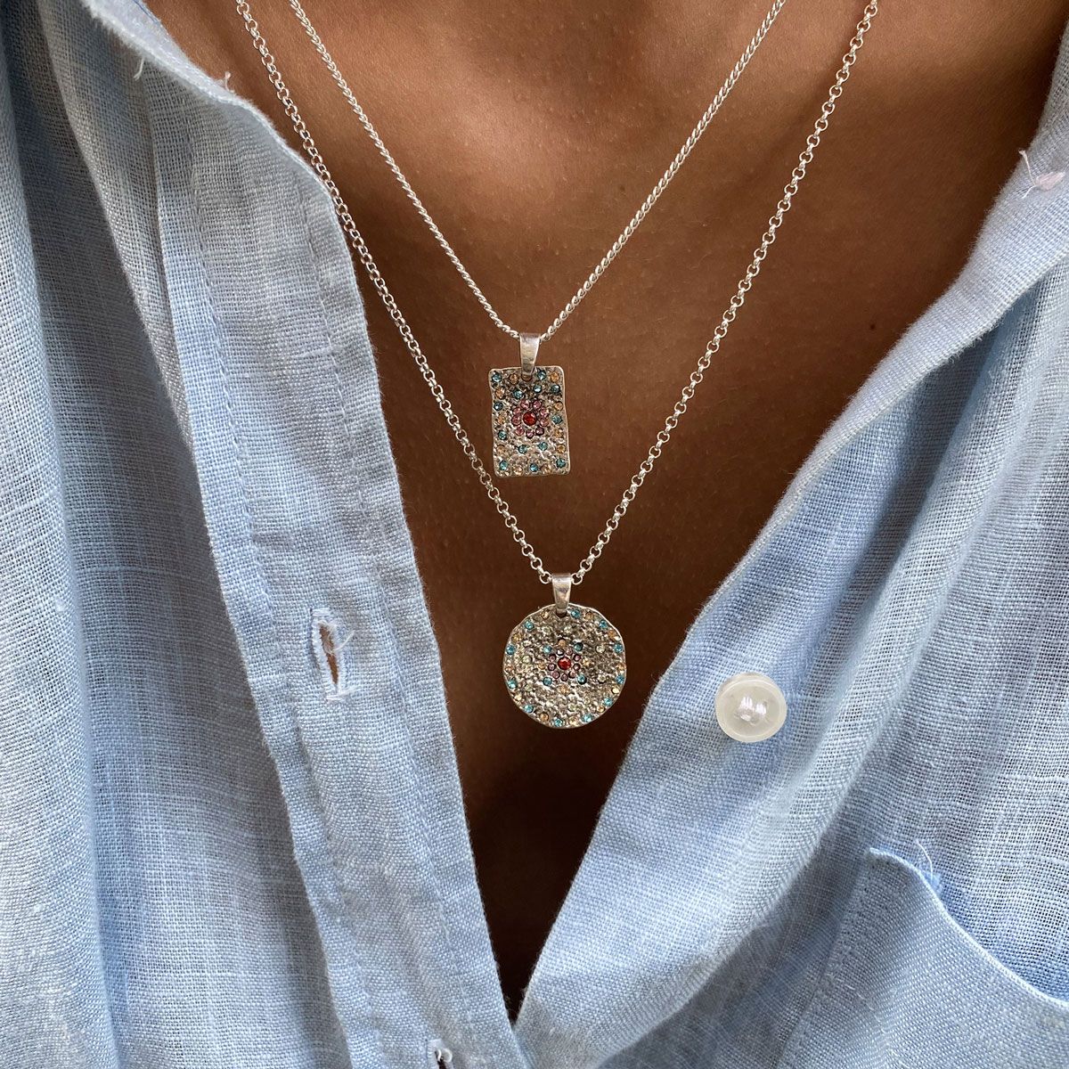 Vibrance is a beautiful, colorful collection adding that perfect touch with your outfit. The collection is based on textured coins adorned with sparkling, colorful stones. Here you can choose single pendants which are perfect for layering. Or if you prefer a bolder look, choose pieces with charms - one of this season"s major trends. Plated with real gold and real silver.
