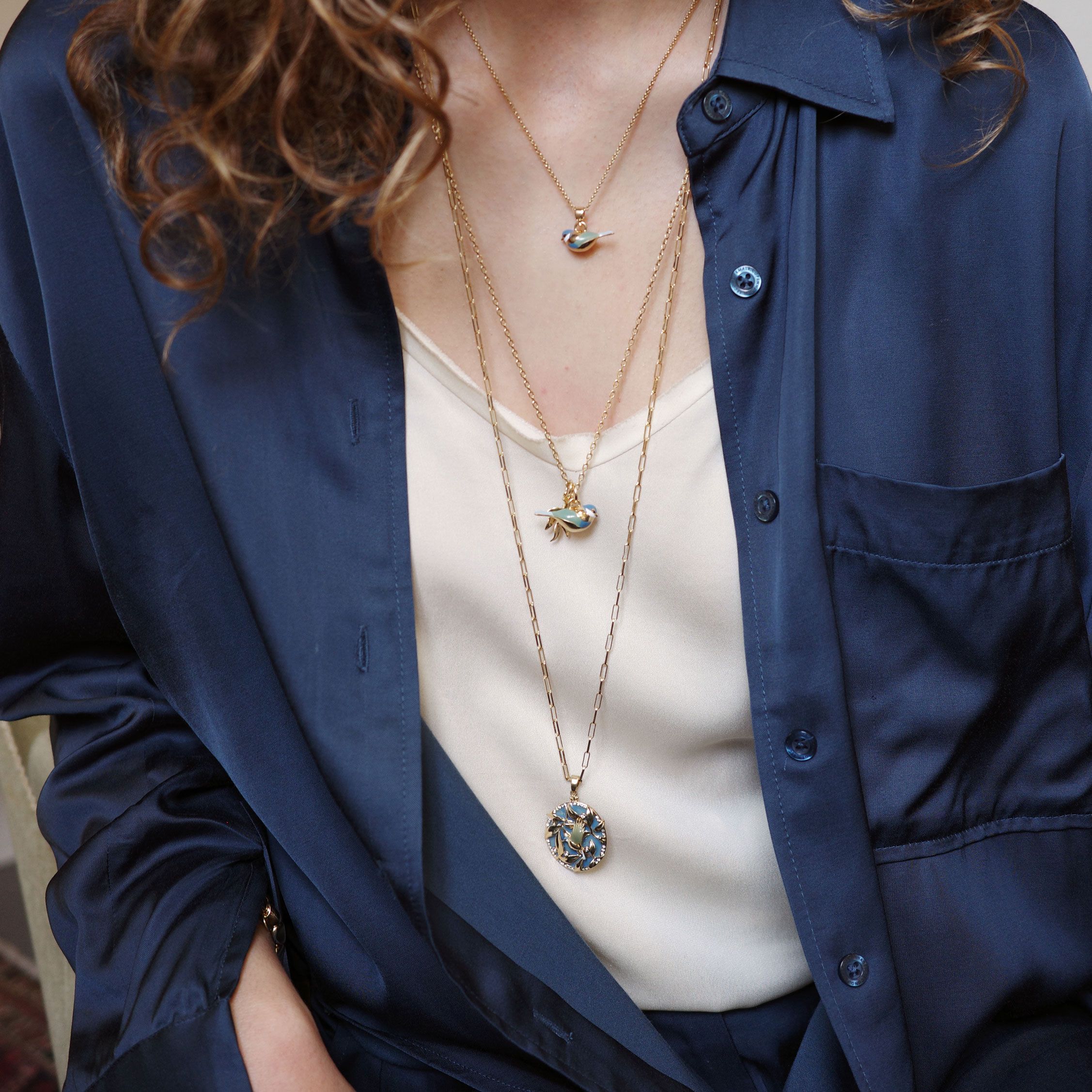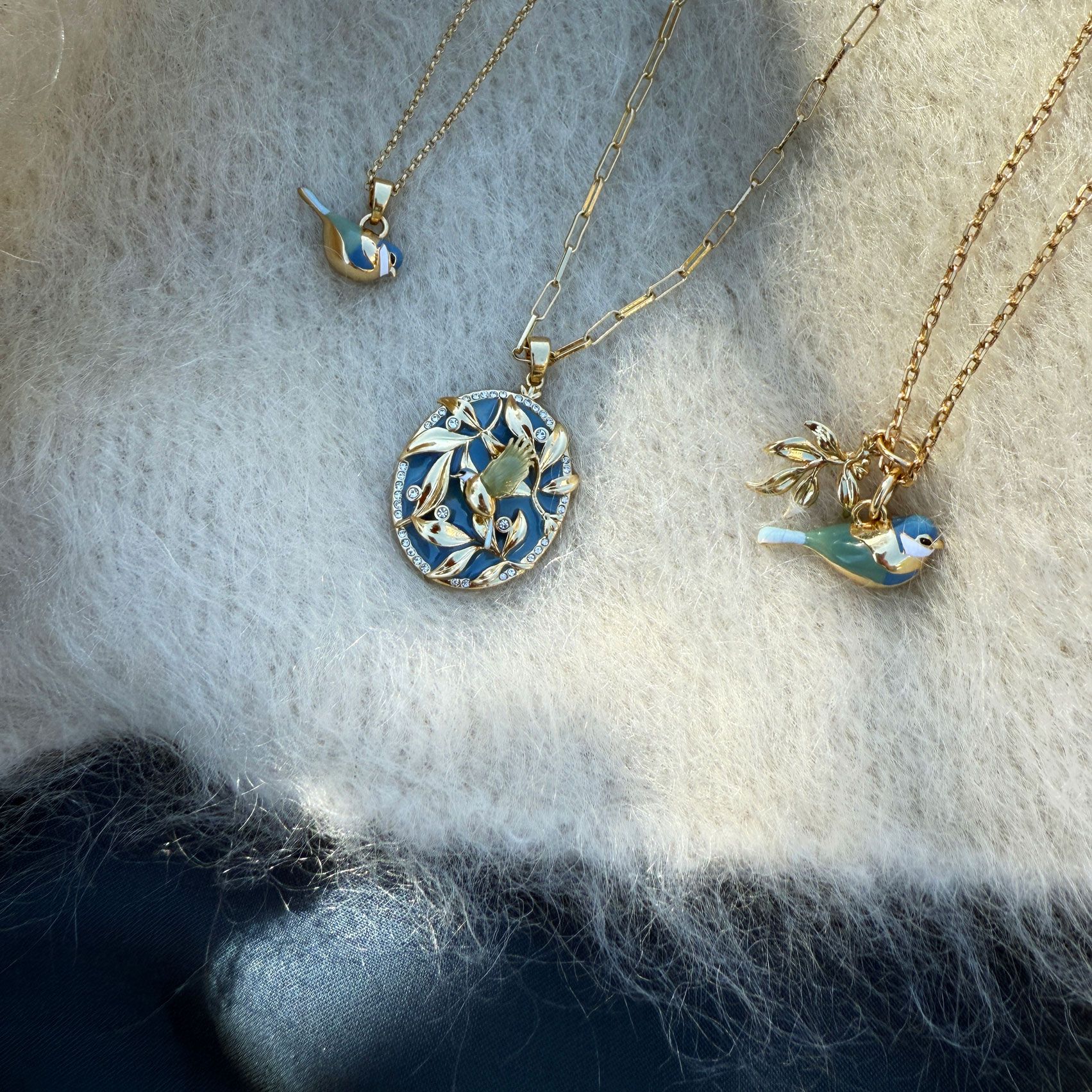 The sweet blue tit is a resilient little creature who survives the cold winter in the north with the help of its flock. This is a collection with beautiful details, inspired by William Morris, decorated with hand-painted enamel. A lovely gift collection featuring jewellery for both special occasions and everyday wear. The pieces are plated with real gold.