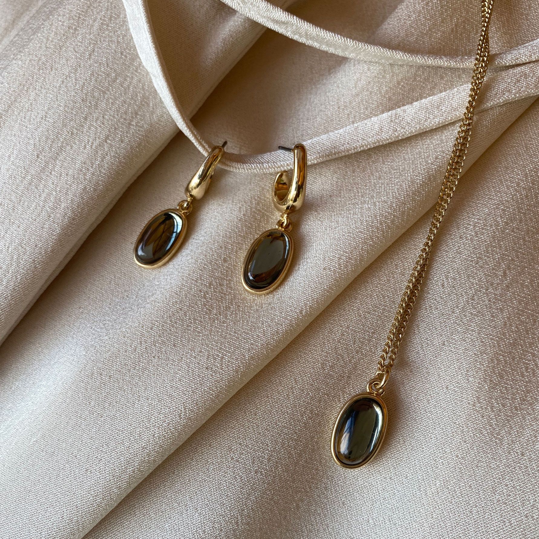 Soft metallic shapes and drops in hand-cut glass. A sleek and timeless collection that works just as well for everyday wear as for special occasions. The jewellery is plated with real gold.