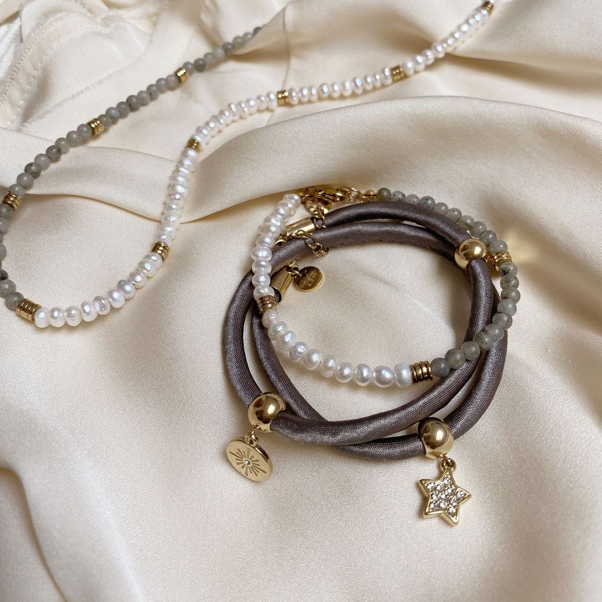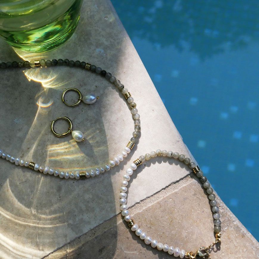 Stainless steel bracelet gold plated with insert from labradorite and pearl